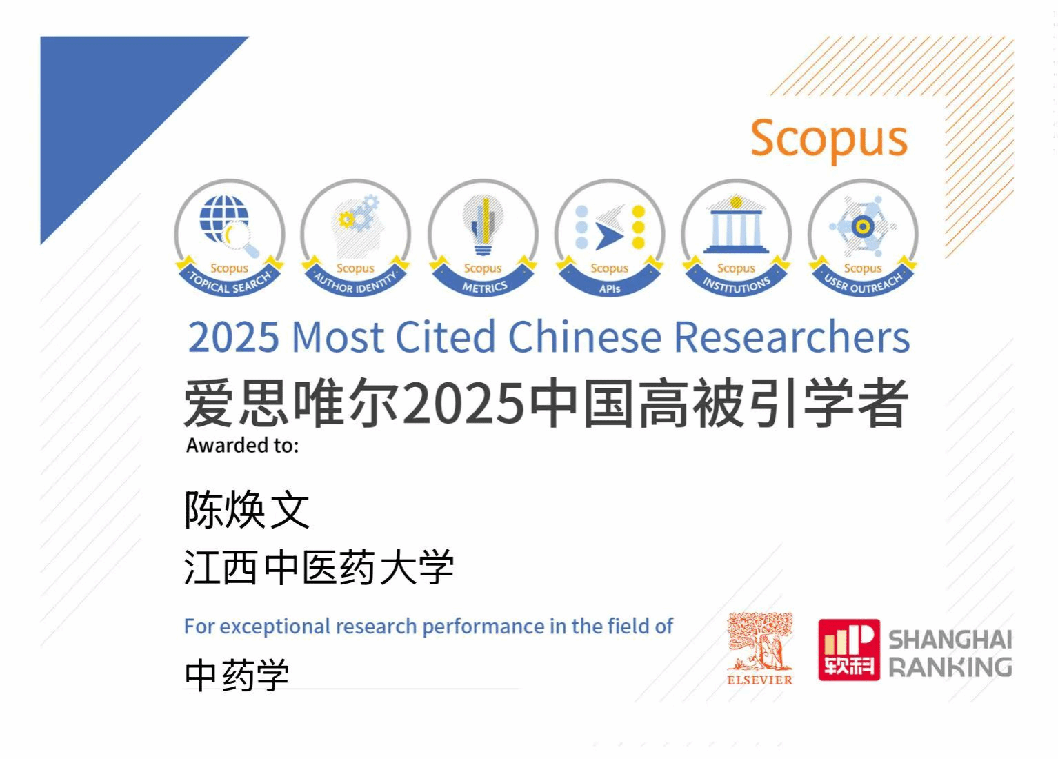 近日,爱思唯尔(Elsevier)正式发布2025年“中国高被引学者”(2025 Most Cited Chinese Researchers)榜单,我校陈焕文教授再次入选。